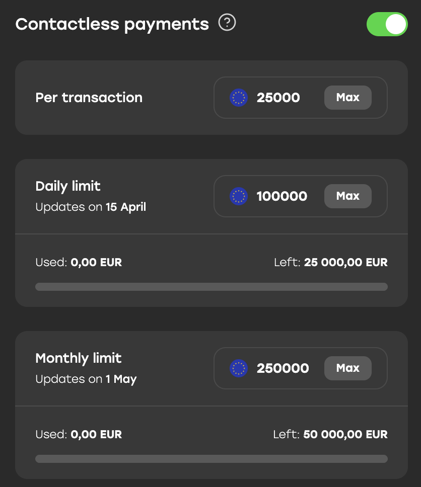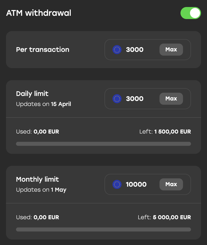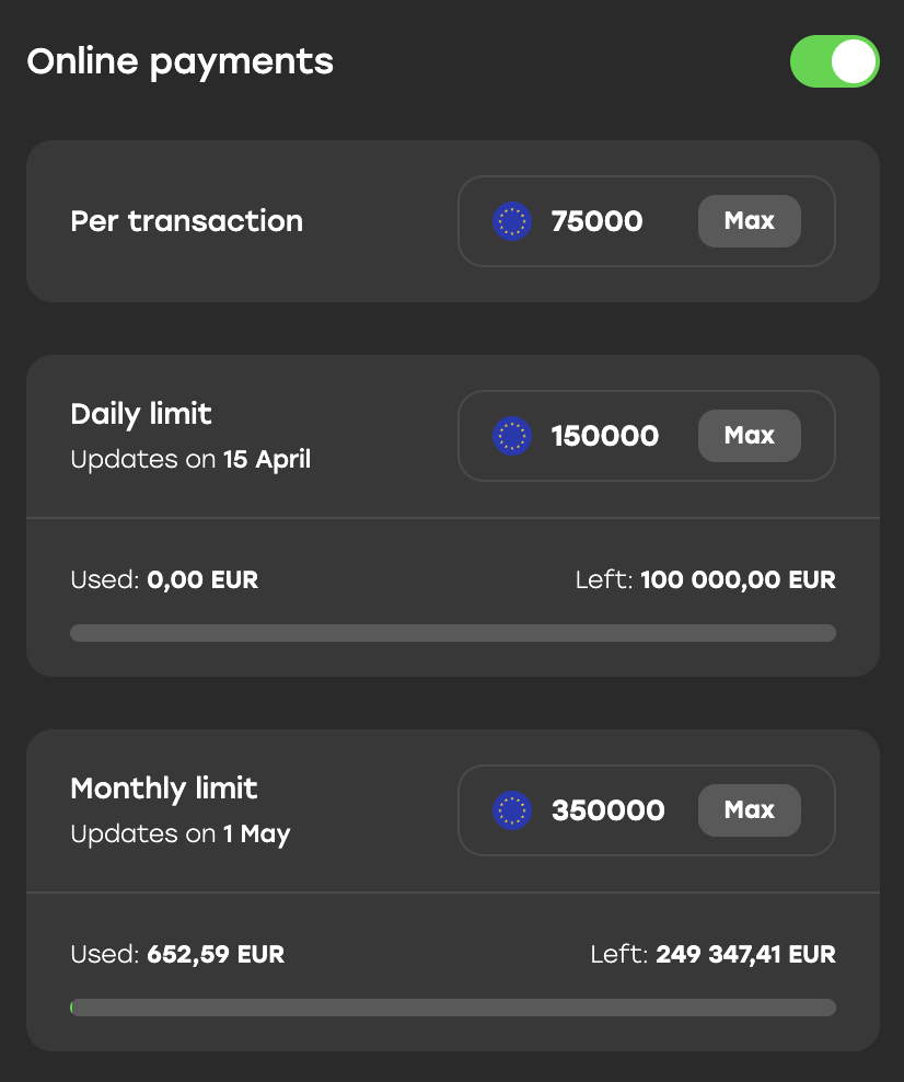 When you select a transaction type, you can adjust its limit typing in the desired amount or clicking the Max button to set the maximum available limit.